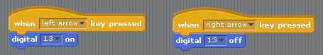 If you go to the blue “Motion” section, you should see all of S4A’s special Arduino blocks. We will look at all of these over the coming weeks, but to start off with, we are going to concentrate on using these two :