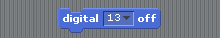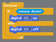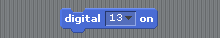 These let us turn pins 10-13 on or off. It just so happens that the Arduino has an LED light already attached to pin 13. Try dragging these blocks into your workspace, clicking on them to turn the LED on and off and see if you can spot where it is on the board.