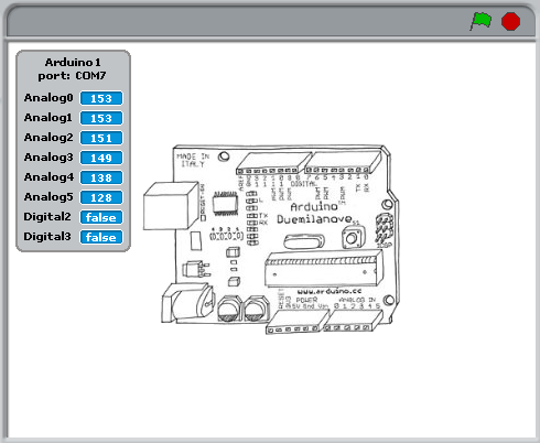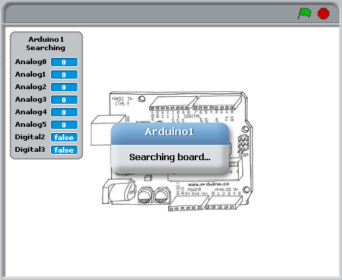 When you connect the Arduino, the “Searching…” message should disappear and the numbers on the analog pins should start jumping around